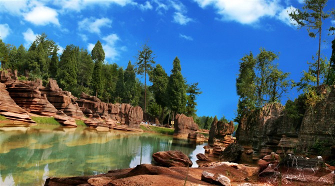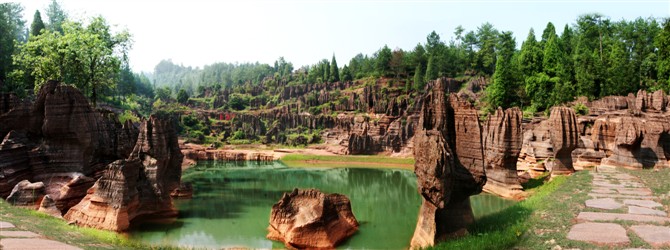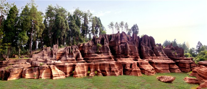據(jù)地質(zhì)專家考證:紅色石林巖石形成的歷史約4。5億年,地質(zhì)史上稱之為揚(yáng)子古海(海底沉積了大量混合泥沙的碳酸鹽物質(zhì),經(jīng)地殼運(yùn)動(dòng)和侵蝕、溶蝕作用形成了這片美麗的地質(zhì)奇觀)。景區(qū)內(nèi)遍布高大奇石,造型各異、顏色變化多端,且隨天氣、時(shí)間、季節(jié)變化而變化,晴紅雨黑、陰轉(zhuǎn)褐紅、晨昏有別。 景區(qū)內(nèi)石景有:蜀犬吠日、乳燕待哺、樓蘭古城、蝸牛搬家、七彩迷宮、利劍刺空、航母巡游、石兵列陣、少女出浴、觀音坐蓮、石鞭候主、靈龜探海、粽熊迎客、天狗吠日、水獺望云、母雞搗窩、駝鈴聲聲····尤以“巨人圓”、“古城故宮”、“八卦奇陣”、“諸葛藏書”為奇石絕景中的最佳。 景區(qū)內(nèi)還有地下溶洞、絕壁天坑、神秘地坑、千年古木、土家山寨、土風(fēng)民俗、集商遺址····